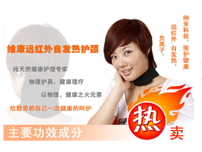 自发热护颈以电器钛为核心,与纳米生物功能材料形成一体组成本产品。在温度、压力变化的情况下,可连续释放远红外、负离子。并给人体带来了微电流的热电刺激效应。能有效改善血液循环、缓解肌肉疲劳、激活细胞促进新陈代谢、疏通经络、祛风除湿、镇痛去寒、增强机体抗病能力。产品安全,使用方便,作用持久。